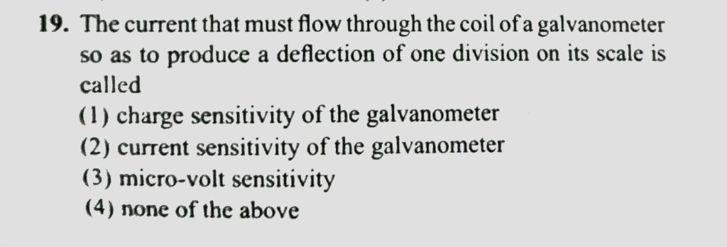 The current that must flow through the coil of a galvanometer so as to produce a deflection of one division on its scale is called The current that must flow through the coil of a galvanometer so as to produce a deflection of one division on its scale is called October 13, 2020 Category: Uncategorised (JEE Advanced Physics by BM Sharma + GMP Solutions) , Facebook Messenger WhatsApp Share this:TwitterFacebook Related