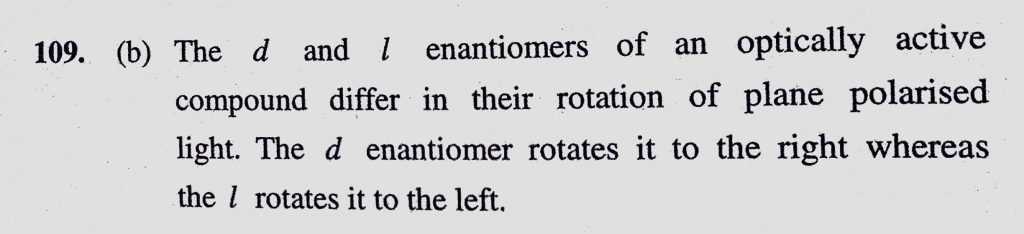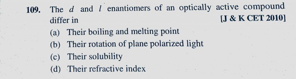 The d and l enantiomers of an optically active compound differ in (a) Their boiling and melting point (b) Their rotation of plane polarized light The d and l enantiomers of an optically active compound differ in (a) Their boiling and melting point (b) Their rotation of plane polarized light December 10, 2020 Category: Uncategorised (JEE Advanced Physics by BM Sharma + GMP Solutions) , Facebook Messenger WhatsApp Share this:TwitterFacebook Related