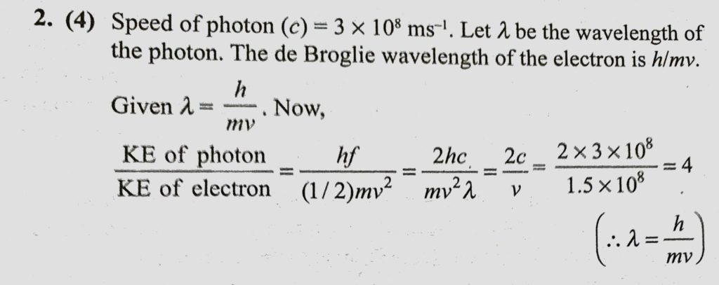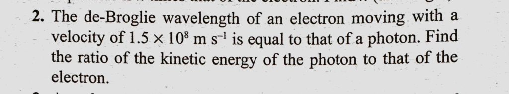 The de-Broglie wavelength of an electron moving with a velocity of 1.5 * 10^8 m/s is equal to that of a photon. Find the ratio of the kinetic energy of the photon to that of the electron. The de-Broglie wavelength of an electron moving with a velocity of 1.5 * 10^8 m/s is equal to that of a photon. Find the ratio of the kinetic energy of the photon to that of the electron. October 14, 2020 Category: Uncategorised (JEE Advanced Physics by BM Sharma + GMP Solutions) , Facebook Messenger WhatsApp Share this:TwitterFacebook Related