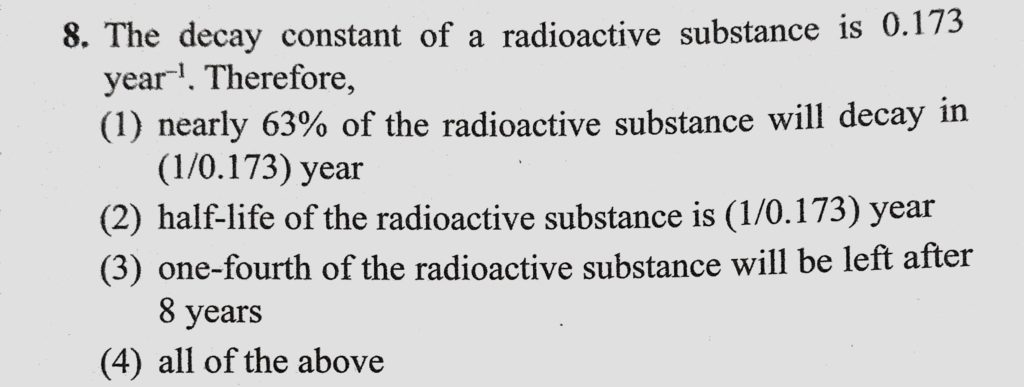 The decay constant of a radioactive substance is 0.173 year^-1. Therefore, (1) nearly 63% of the radioactive substance will decay in (1/0.173) year (1) nearly 63% of the radioactive substance will decay in (1/0.173) year The decay constant of a radioactive substance is 0.173 year^-1. Therefore October 18, 2020 Category: Uncategorised (JEE Advanced Physics by BM Sharma + GMP Solutions) , Facebook Messenger WhatsApp Share this:TwitterFacebook Related