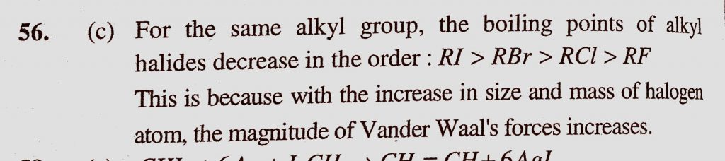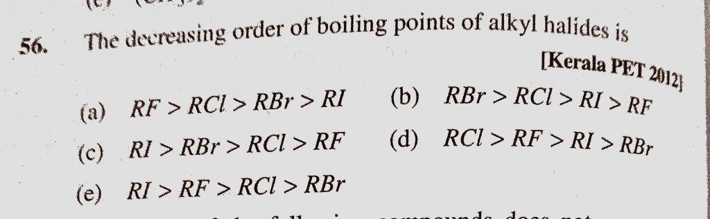 The decreasing order of boiling points of alkyl halides is (a) RF > RCl > RBr > RI (b) RBr > RCl > RI > RF (c) RI > RBr > RCl > RF The decreasing order of boiling points of alkyl halides is (a) RF > RCl > RBr > RI (b) RBr > RCl > RI > RF (c) RI > RBr > RCl > RF February 8, 2021 Category: Uncategorised (JEE Advanced Physics by BM Sharma + GMP Solutions) , Facebook Messenger WhatsApp Share this:TwitterFacebook Related