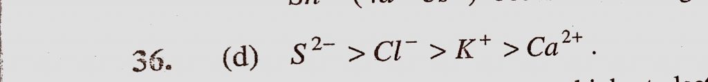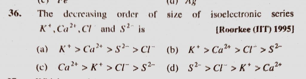 The decreasing order of size of isoelectronic series K+ , Ca 2+ , Cl – and S2- is Ca 2+ Cl - and S2- is The decreasing order of size of isoelectronic series K+ November 10, 2020 Category: Uncategorised (JEE Advanced Physics by BM Sharma + GMP Solutions) , Facebook Messenger WhatsApp Share this:TwitterFacebook Related