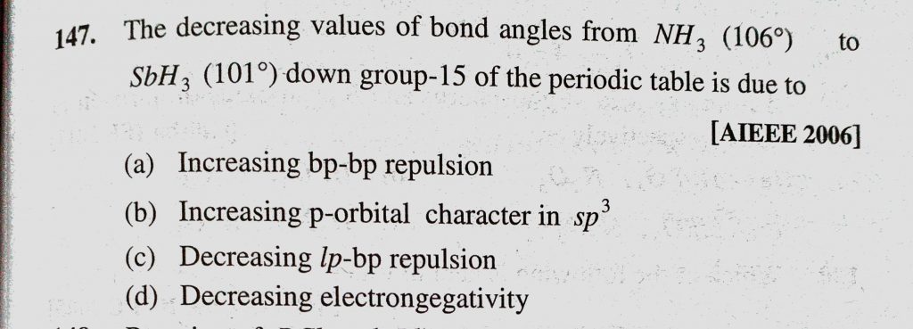 The decreasing values of bond angles from NH3 (106) to SbH3 (101) down group-15 of the periodic table is due to (a) Increasing bp-bp repulsion The decreasing values of bond angles from NH3 (106) to SbH3 (101) down group-15 of the periodic table is due to (a) Increasing bp-bp repulsion November 23, 2020 Category: Uncategorised (JEE Advanced Physics by BM Sharma + GMP Solutions) , Facebook Messenger WhatsApp Share this:TwitterFacebook Related