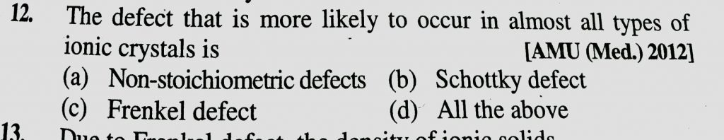 The defect that is more likely to occur in almost all types of ionic crystals is (a) Non – stoichiometric defects (b) Schottky defect (c) Frenkel defect (d) All of the above The defect that is more likely to occur in almost all types of ionic crystals is (a) Non - stoichiometric defects (b) Schottky defect (c) Frenkel defect (d) All of the above February 9, 2021 Category: Uncategorised (JEE Advanced Physics by BM Sharma + GMP Solutions) , Facebook Messenger WhatsApp Share this:TwitterFacebook Related