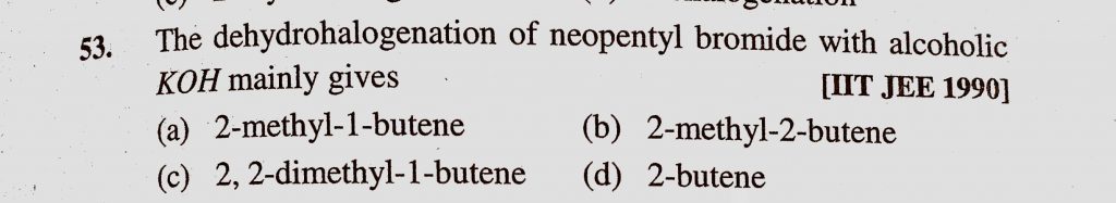 The dehydrohalogenation of neopentyl bromide with alcoholic KOH mainly gives (a) 2-methyl-1-butene (b) 2-methyl-2-butene (c) 2, 2-dimethyl-1-butene 2-dimethyl-1-butene The dehydrohalogenation of neopentyl bromide with alcoholic KOH mainly gives (a) 2-methyl-1-butene (b) 2-methyl-2-butene (c) 2 December 16, 2020 Category: Uncategorised (JEE Advanced Physics by BM Sharma + GMP Solutions) , Facebook Messenger WhatsApp Share this:TwitterFacebook Related
