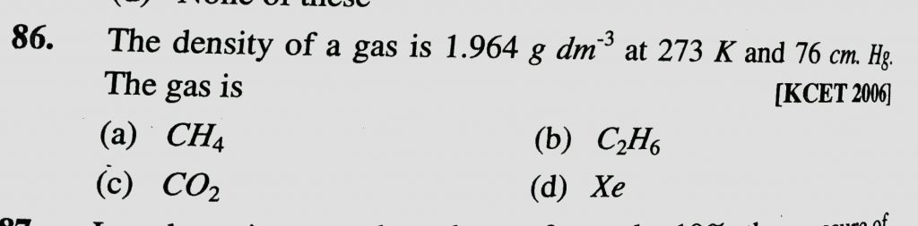 The density of a gas is 1.964 g/dm^3 at 273 K and 76 cm. Hg. The gas is (a) CH4 (b) C2H6 (c) CO2 (d) Xe The density of a gas is 1.964 g/dm^3 at 273 K and 76 cm. Hg. The gas is (a) CH4 (b) C2H6 (c) CO2 (d) Xe February 11, 2021 Category: Uncategorised (JEE Advanced Physics by BM Sharma + GMP Solutions) , Facebook Messenger WhatsApp Share this:TwitterFacebook Related