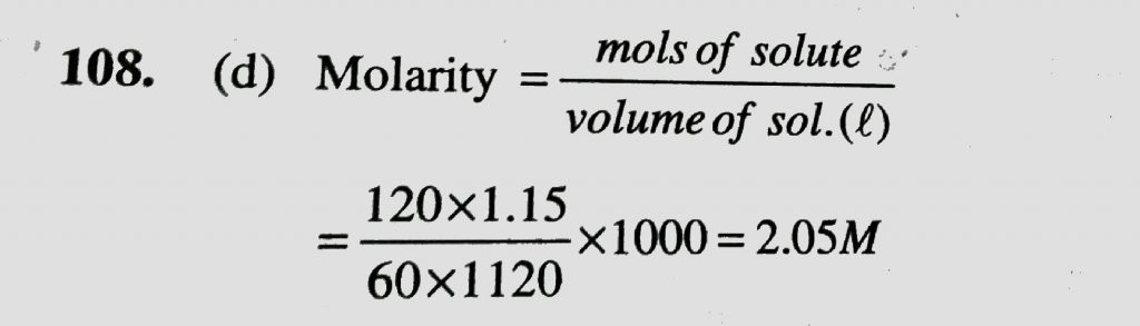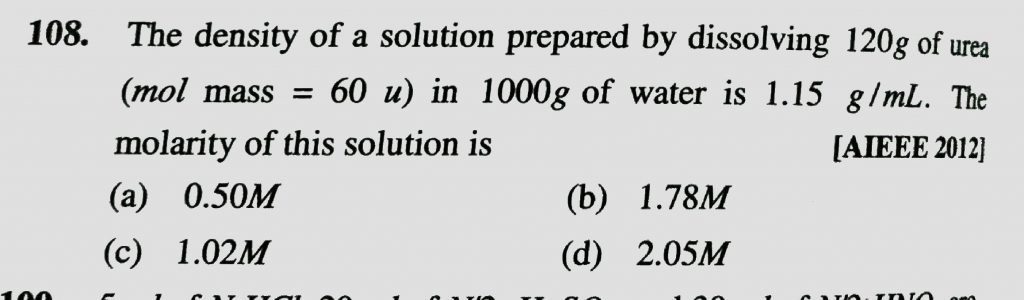 The density of a solution prepared by dissolving 120 g of urea ( mol mass = 60 u ) in 1000 g of water is 1.15 g / mL .. The molarity of this solution is The density of a solution prepared by dissolving 120 g of urea ( mol mass = 60 u ) in 1000 g of water is 1.15 g / mL .. The molarity of this solution is December 11, 2020 Category: Uncategorised (JEE Advanced Physics by BM Sharma + GMP Solutions) , Facebook Messenger WhatsApp Share this:TwitterFacebook Related