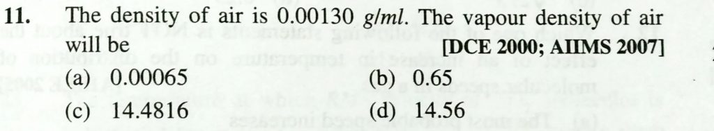 The density of air is 0.00130 g/ml. The vapour density of air will be (a) 0.00065 (b) 0.65 (c) 14.4816 (d0 14.56 The density of air is 0.00130 g/ml. The vapour density of air will be (a) 0.00065 (b) 0.65 (c) 14.4816 (d0 14.56 February 11, 2021 Category: Uncategorised (JEE Advanced Physics by BM Sharma + GMP Solutions) , Facebook Messenger WhatsApp Share this:TwitterFacebook Related