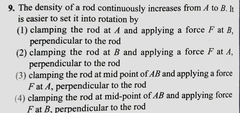 The density of rod continuously increases from A to B . It is easier to set it into rotation by The density of rod continuously increases from A to B . It is easier to set it into rotation by September 25, 2020 Category: Uncategorised (JEE Advanced Physics by BM Sharma + GMP Solutions) , Facebook Messenger WhatsApp Share this:TwitterFacebook Related