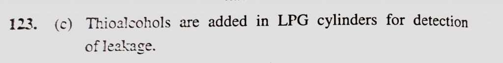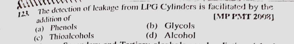 The detection of leakage from LPG cylinders is facilitated by the addition of (a) Phenols (b) Glycols (c) Thioalcohols (d) Alcohol The detection of leakage from LPG cylinders is facilitated by the addition of (a) Phenols (b) Glycols (c) Thioalcohols (d) Alcohol February 14, 2021 Category: Uncategorised (JEE Advanced Physics by BM Sharma + GMP Solutions) , Facebook Messenger WhatsApp Share this:TwitterFacebook Related