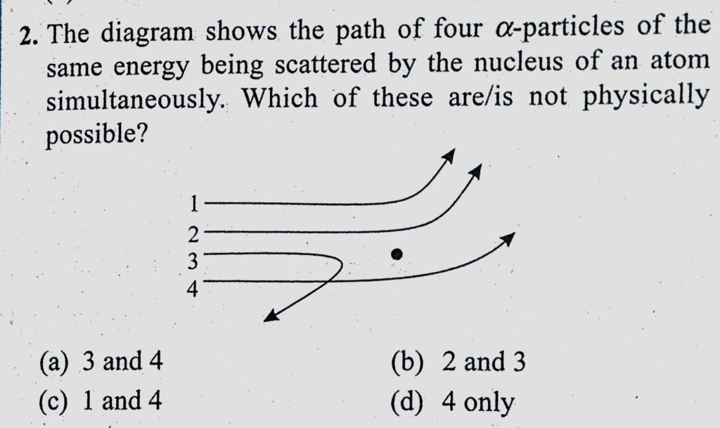 The diagram shows the path of four alpha particles of the same energy being scattered by the nucleus of an atom simultaneously. Which of these are/is not physically possible? The diagram shows the path of four alpha particles of the same energy being scattered by the nucleus of an atom simultaneously. Which of these are/is not physically possible? October 15, 2020 Category: Uncategorised (JEE Advanced Physics by BM Sharma + GMP Solutions) , Facebook Messenger WhatsApp Share this:TwitterFacebook Related