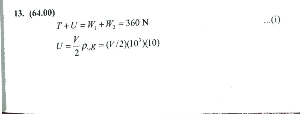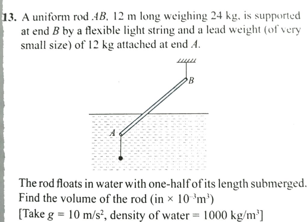 A uniform rod AB, 12 m long weighing 24 kg, is supported at end B by a flexible light string and a lead weight (of very small size) of 12kg attached at end A. The rod floats in water with one-half of its length submerged. For this situation, mark out the correct statement. [Take g = 10 m/s ^2 , density of water =1000 kg/m ^ 3 ]