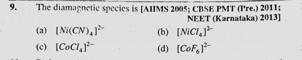 The diamagnetic species is (a) (Ni(CN)4)2- (b) (NiCl4) 2- (c) (CoCl4)2- (d) (CoF6)2- The diamagnetic species is (a) (Ni(CN)4)2- (b) (NiCl4) 2- (c) (CoCl4)2- (d) (CoF6)2- December 4, 2020 Category: Uncategorised (JEE Advanced Physics by BM Sharma + GMP Solutions) , Facebook Messenger WhatsApp Share this:TwitterFacebook Related
