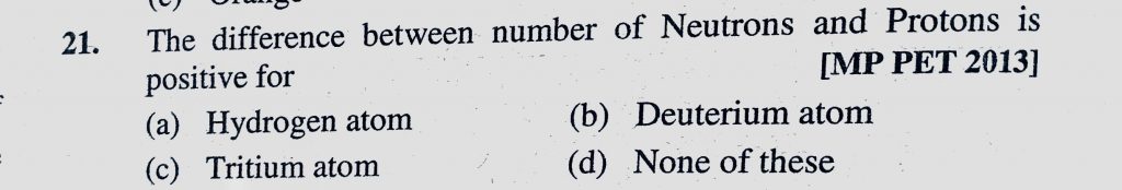 The difference between number of Neutrons and Protons is positive for (a) Hydrogen atom (b) Deuterium atom (c) Tritium atom (d) None of these The difference between number of Neutrons and Protons is positive for (a) Hydrogen atom (b) Deuterium atom (c) Tritium atom (d) None of these November 13, 2020 Category: Uncategorised (JEE Advanced Physics by BM Sharma + GMP Solutions) , Facebook Messenger WhatsApp Share this:TwitterFacebook Related