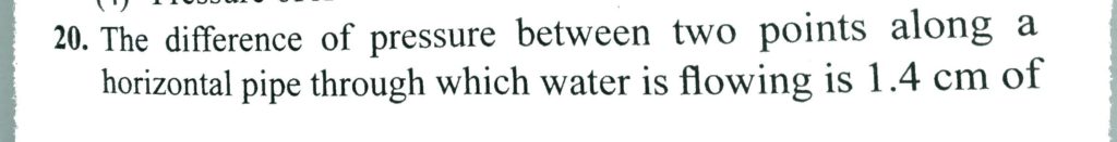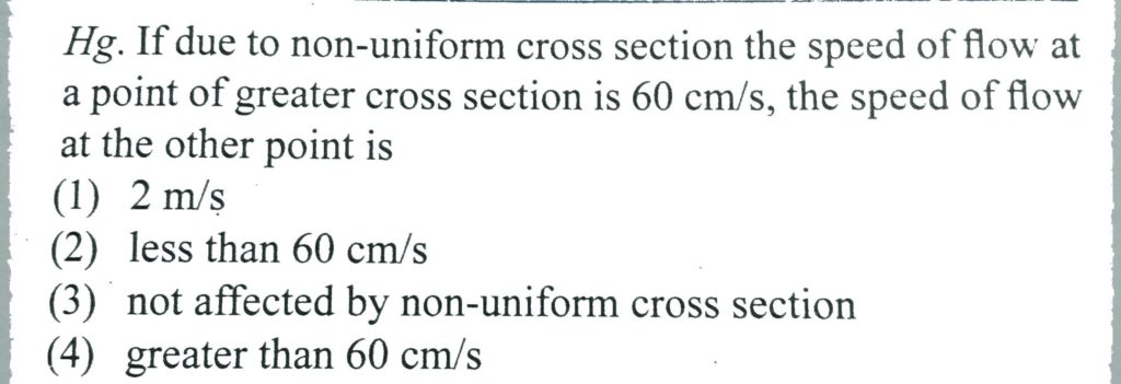 The difference of pressure between two points along a horizontal pipe through which water is flowing is 1.4 cm of Hg. If due to non-uniform cross section the speed of flow at a point of greater cross section is 60 cm/s, the speed of flow at the other point is