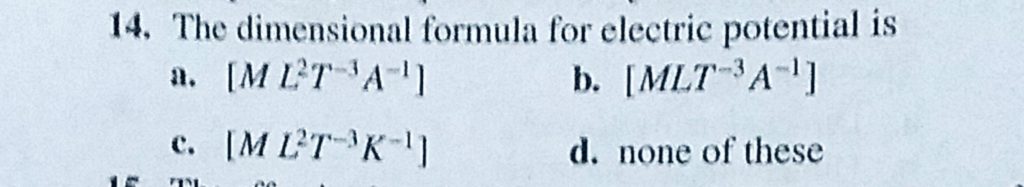 The dimensional formula for electric potential is The dimensional formula for electric potential is September 15, 2020 Category: Uncategorised (JEE Advanced Physics by BM Sharma + GMP Solutions) , Facebook Messenger WhatsApp Share this:TwitterFacebook Related