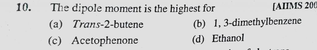 The dipole moment is the highest for (a) Trans-2-butene (b) 1,3-dimethylbenzene (c) Acetophenone (d) Ethanol 3-dimethylbenzene (c) Acetophenone (d) Ethanol The dipole moment is the highest for (a) Trans-2-butene (b) 1 December 8, 2020 Category: Uncategorised (JEE Advanced Physics by BM Sharma + GMP Solutions) , Facebook Messenger WhatsApp Share this:TwitterFacebook Related