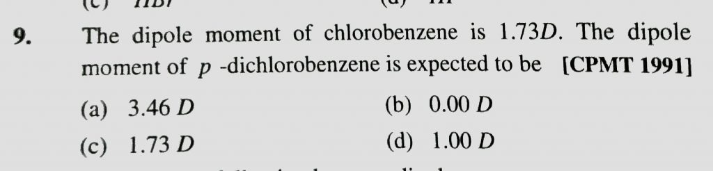 The dipole moment of chlorobenzene is 1.73D. The dipole moment of p – dichlorobenzene is expected to be The dipole moment of chlorobenzene is 1.73D. The dipole moment of p - dichlorobenzene is expected to be December 2, 2020 Category: Uncategorised (JEE Advanced Physics by BM Sharma + GMP Solutions) , Facebook Messenger WhatsApp Share this:TwitterFacebook Related