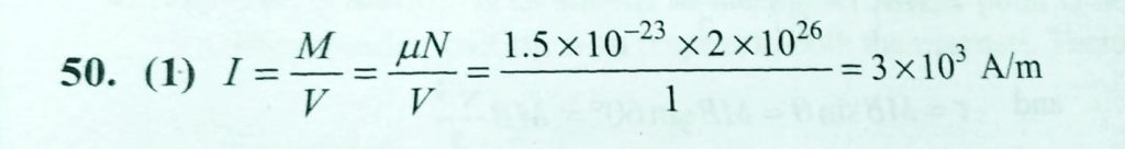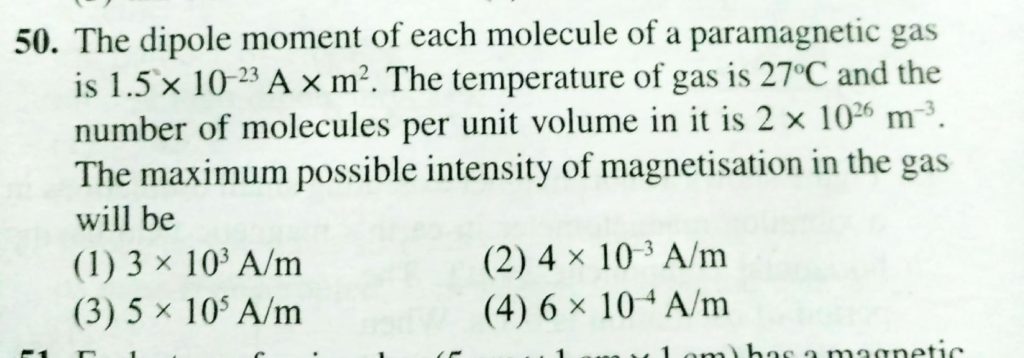 The dipole moment of each molecule of a paramagnetic gas is 1.5 × 10^−23 amp × m^2. The temperature of gas is 27∘ and the number of molecules per unit volume in it is 2 × 10^26 m^−3. The maximum possible intensity of magnetisation in the gas will be the apparent dip will be given tanδ1 which is equal to: the axis of the dip needle is perpendicular to the magnetic meridian. If the axis of the dip needle makes angle θ with the magnetic meridian The dip at a place is delta. For measuring it October 18, 2020 Category: Uncategorised (JEE Advanced Physics by BM Sharma + GMP Solutions) , Facebook Messenger WhatsApp Share this:TwitterFacebook Related