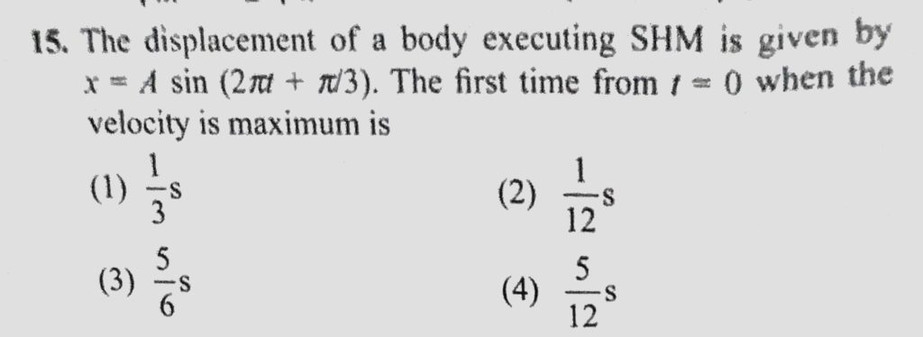 The displacement of a body executing SHM is given by x = A sin (2 pie t + pie/3) . The first time from t = 0 when the velocity is maximum is The displacement of a body executing SHM is given by x = A sin (2 pie t + pie/3) . The first time from t = 0 when the velocity is maximum is October 30, 2020 Category: Uncategorised (JEE Advanced Physics by BM Sharma + GMP Solutions) , Facebook Messenger WhatsApp Share this:TwitterFacebook Related