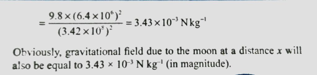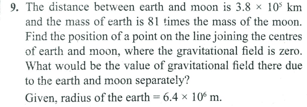 The distance between earth and moon is about 3.8 × 10^5km and the mass of earth 81 times the mass of the moon. Find the position of a point on the line line joining the centres of earth and moon, where the gravitional field is zero. What would be the value of gravitional field there due to the earth and moon seperately?