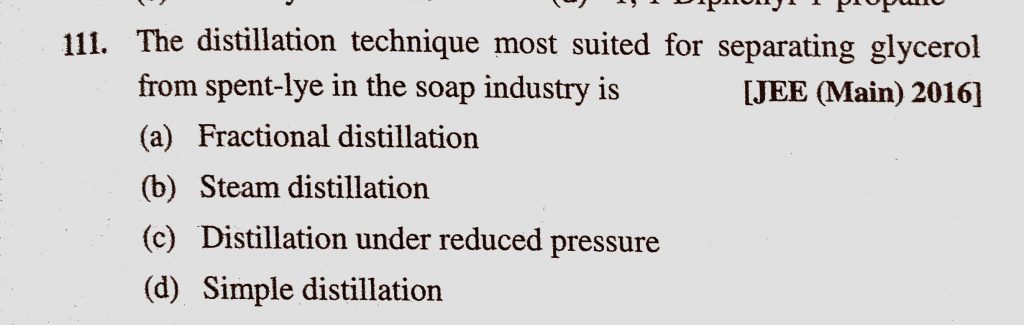 The distillation technique most suited for separating glycerol from spent – lye in the soap industry is (a) Fractional distillation (b) Steam distillation The distillation technique most suited for separating glycerol from spent - lye in the soap industry is (a) Fractional distillation (b) Steam distillation December 11, 2020 Category: Uncategorised (JEE Advanced Physics by BM Sharma + GMP Solutions) , Facebook Messenger WhatsApp Share this:TwitterFacebook Related
