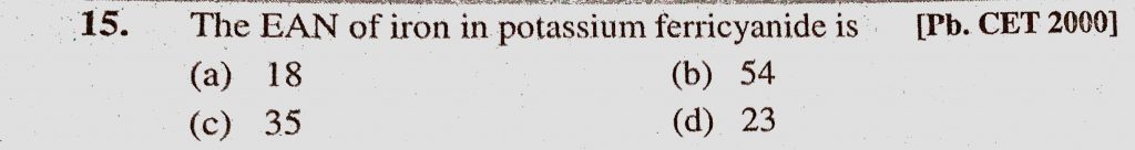 The EAN of iron in potassium ferricyanide is (a) 18 (b) 53 (c) 35 (d)23 The EAN of iron in potassium ferricyanide is (a) 18 (b) 53 (c) 35 (d)23 December 3, 2020 Category: Uncategorised (JEE Advanced Physics by BM Sharma + GMP Solutions) , Facebook Messenger WhatsApp Share this:TwitterFacebook Related