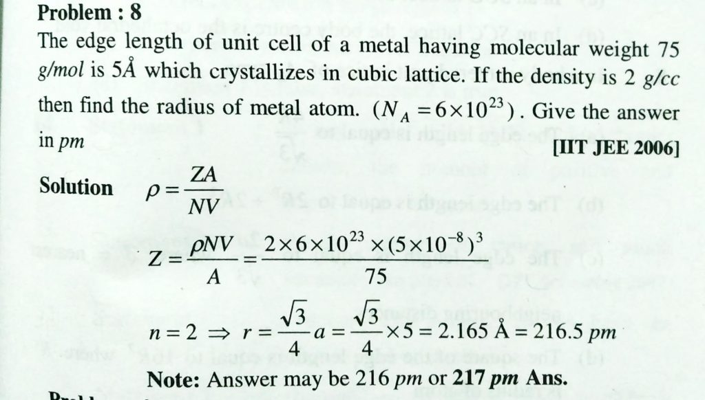 The edge length of unit cell of a metal having molecular weight 75 g/mol is 5 A which crystallizes in cubic lattice. IF density is 2 g/cc then find the radius of metal atom . (Na = 6 x 10^23 ) . Give the answer in pm Sodium atom crystallizes in body centred cubic with a = 4.29 A. The radius of sodium atom is February 10, 2021 Category: Uncategorised (JEE Advanced Physics by BM Sharma + GMP Solutions) , Facebook Messenger WhatsApp Share this:TwitterFacebook Related