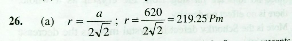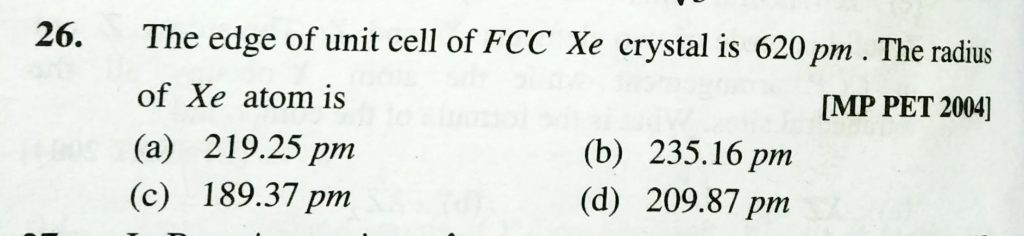 The edge of unit cell of FCC Xe crystal is 620 pm . The radius of Xe atom is (a) 219.25 pm (b) 235.16 pm (c) 189.37 pm (d) 209.87 pm The edge of unit cell of FCC Xe crystal is 620 pm . The radius of Xe atom is (a) 219.25 pm (b) 235.16 pm (c) 189.37 pm (d) 209.87 pm February 9, 2021 Category: Uncategorised (JEE Advanced Physics by BM Sharma + GMP Solutions) , Facebook Messenger WhatsApp Share this:TwitterFacebook Related
