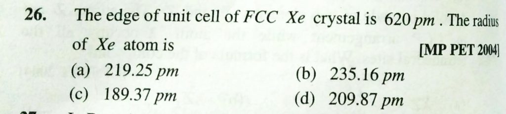 The edge of unit cell of FCC Xe crystal is 620 pm. The radius of Xe atom is The edge of unit cell of FCC Xe crystal is 620 pm. The radius of Xe atom is December 17, 2020 Category: Uncategorised (JEE Advanced Physics by BM Sharma + GMP Solutions) , Facebook Messenger WhatsApp Share this:TwitterFacebook Related