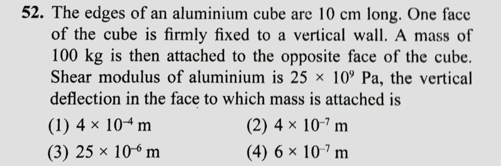 The edges of an aluminum cube are 10 cm long. One face of the cube is firmly fixed to a vertical wall. A mass of 100kg is then attached to the opposite face of the cube. Shear modulus of aluminum is 25 × 10^9 Pa, the vertical deflection in the face to which mass is attached is