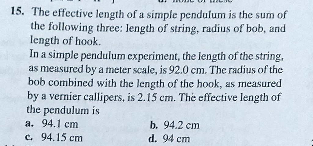 The effective length of a simple pendulum is the sum of the following three: length of string, radius of bob, and length of hook. In a simple pendulum experiment, the length of the string, as measured and length of hook. In a simple pendulum experiment as measured radius of bob The effective length of a simple pendulum is the sum of the following three: length of string the length of the string September 15, 2020 Category: Uncategorised (JEE Advanced Physics by BM Sharma + GMP Solutions) , Facebook Messenger WhatsApp Share this:TwitterFacebook Related