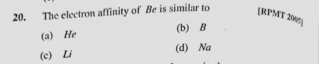 The electron affinity of Be is similar to (a) He (b) B (c) Li (d) Na The electron affinity of Be is similar to (a) He (b) B (c) Li (d) Na November 10, 2020 Category: Uncategorised (JEE Advanced Physics by BM Sharma + GMP Solutions) , Facebook Messenger WhatsApp Share this:TwitterFacebook Related