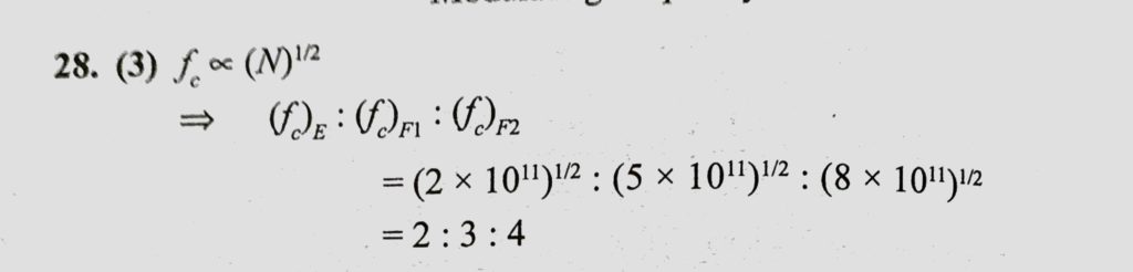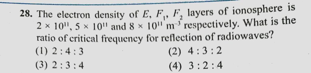 The electron density of E, F1, F2 layers of ionosphere is 2 * 10^11, 5 * 10^11 and 8 * 10^11 m^-3 respectively. What is the ratio of critical frequency for reflection of radiowaves ? 5 * 10^11 and 8 * 10^11 m^-3 respectively. What is the ratio of critical frequency for reflection of radiowaves ? F1 F2 layers of ionosphere is 2 * 10^11 The electron density of E October 23, 2020 Category: Uncategorised (JEE Advanced Physics by BM Sharma + GMP Solutions) , Facebook Messenger WhatsApp Share this:TwitterFacebook Related