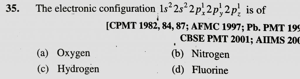 The electronic configuration 1s^2 2s^2 2px^1 2py^1 2pz^! is of (a) oxygen (b) nitrogen (c) hydrogen (d) fluorine The electronic configuration 1s^2 2s^2 2px^1 2py^1 2pz^! is of (a) oxygen (b) nitrogen (c) hydrogen (d) fluorine November 28, 2020 Category: Uncategorised (JEE Advanced Physics by BM Sharma + GMP Solutions) , Facebook Messenger WhatsApp Share this:TwitterFacebook Related