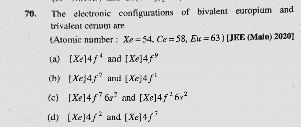 The electronic configurations of bivalent europium and trivalent cerium are (Atomic number : Xe = 54 , Ce = 58, Eu = 63) Ce = 58 Eu = 63 The electronic configurations of bivalent europium and trivalent cerium are (Atomic number : Xe = 54 December 3, 2020 Category: Uncategorised (JEE Advanced Physics by BM Sharma + GMP Solutions) , Facebook Messenger WhatsApp Share this:TwitterFacebook Related