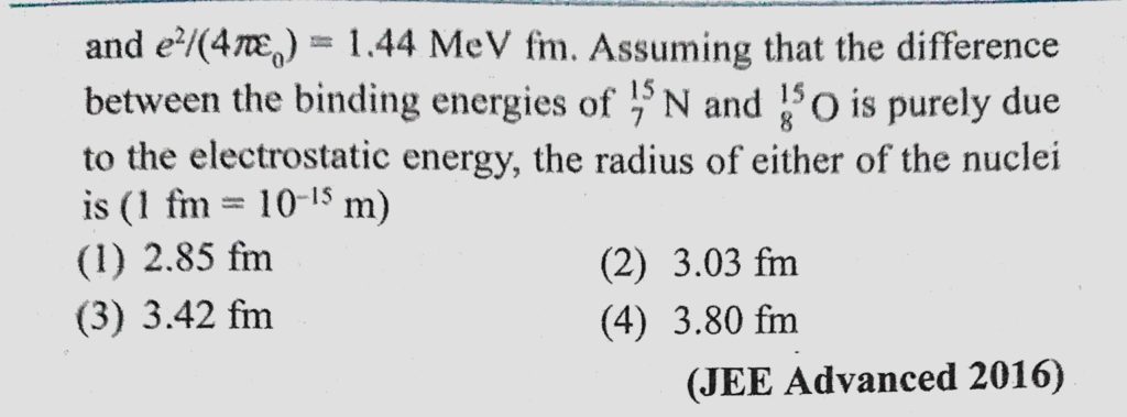 The electrostatic energy of Z protons uniformly distributed throughout a spherical nucleus of radius R is given by E = 3 Z (Z-1)e^2/5 4 pie e0 R The measured masses of the neutron 1H1 , 15N7, and 15O8 are 1.008665 u, 1.007825 u, 1.007825 u 15N7 and 15O8 are 1.008665 u The electrostatic energy of Z protons uniformly distributed throughout a spherical nucleus of radius R is given by E = 3 Z (Z-1)e^2/5 4 pie e0 R The measured masses of the neutron 1H1 October 20, 2020 Category: Uncategorised (JEE Advanced Physics by BM Sharma + GMP Solutions) , Facebook Messenger WhatsApp Share this:TwitterFacebook Related