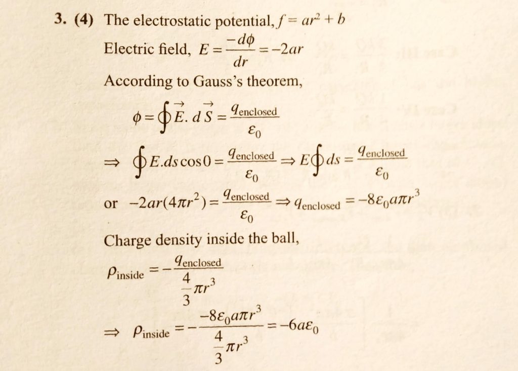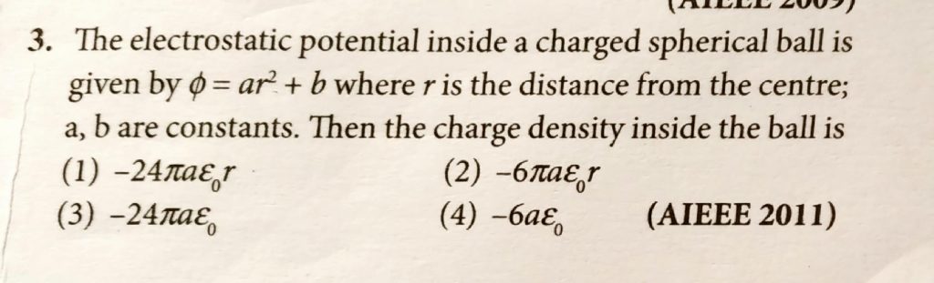 The electrostatic potential inside a charged spherical ball is given by phi = ar^2 where r is the distnce from the center ; a, b are constnts . Then the charge density inside the density the ball is b are constnts . Then the charge density inside the density the ball is The electrostatic potential inside a charged spherical ball is given by phi = ar^2 where r is the distnce from the center ; a November 6, 2020 Category: Uncategorised (JEE Advanced Physics by BM Sharma + GMP Solutions) , Facebook Messenger WhatsApp Share this:TwitterFacebook Related