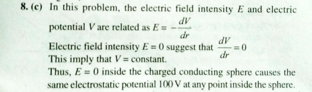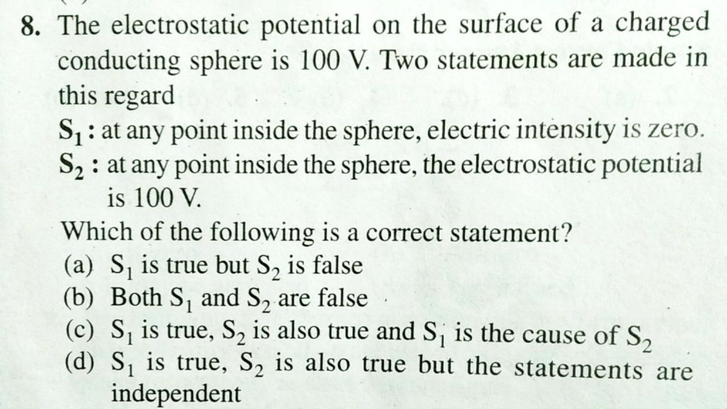 The electrostatic potential on the surface of a charged conducting sphere is 100 V. Two statements are made in this regard S1: at any inside the sphere, electric intensity is zero. S2: at any point inside the sphere, the electrostatic potential is 100 V.