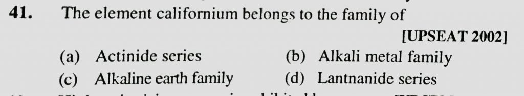 The element californium belongs to the family of (a) Actinide series (b) Alkali metal family (c) Alkaline earth family (d) lantnanide series The element californium belongs to the family of (a) Actinide series (b) Alkali metal family (c) Alkaline earth family (d) lantnanide series February 14, 2021 Category: Uncategorised (JEE Advanced Physics by BM Sharma + GMP Solutions) , Facebook Messenger WhatsApp Share this:TwitterFacebook Related