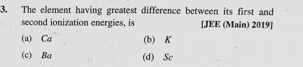 The element having greatest difference between its first and second ionization energies , is (a) Ca (b) K (c) Ba (d) Sc is (a) Ca (b) K (c) Ba (d) Sc The element having greatest difference between its first and second ionization energies November 11, 2020 Category: Uncategorised (JEE Advanced Physics by BM Sharma + GMP Solutions) , Facebook Messenger WhatsApp Share this:TwitterFacebook Related