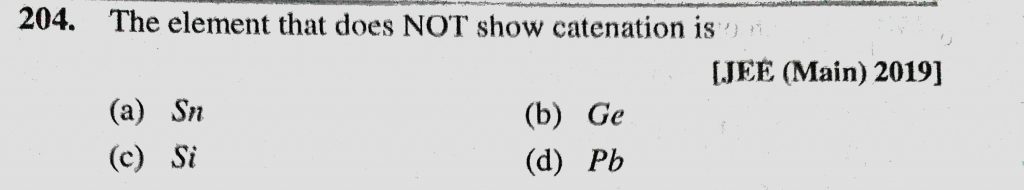 The element that does NOT show catenation is (a) Sn (b) Ge (c) Si (d) Pb The element that does NOT show catenation is (a) Sn (b) Ge (c) Si (d) Pb November 28, 2020 Category: Uncategorised (JEE Advanced Physics by BM Sharma + GMP Solutions) , Facebook Messenger WhatsApp Share this:TwitterFacebook Related