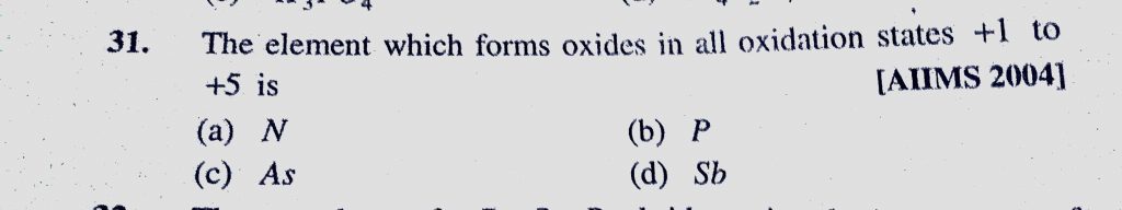 The element which forms oxides in all oxidation states +1 to +5 is (a) N (b) P (c) As (d) Sb The element which forms oxides in all oxidation states +1 to +5 is (a) N (b) P (c) As (d) Sb November 18, 2020 Category: Uncategorised (JEE Advanced Physics by BM Sharma + GMP Solutions) , Facebook Messenger WhatsApp Share this:TwitterFacebook Related