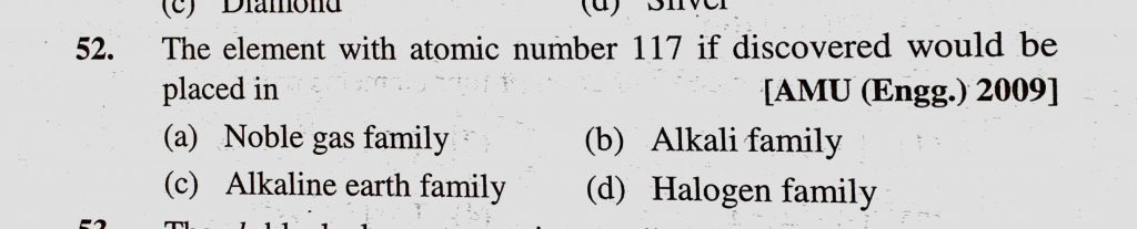 The element with atomic number 117 if discovered would be placed in (a) Noble gas family (b) Alkali family (c) Alkaline earth family (d) Halogen family The element with atomic number 117 if discovered would be placed in (a) Noble gas family (b) Alkali family (c) Alkaline earth family (d) Halogen family November 8, 2020 Category: Uncategorised (JEE Advanced Physics by BM Sharma + GMP Solutions) , Facebook Messenger WhatsApp Share this:TwitterFacebook Related