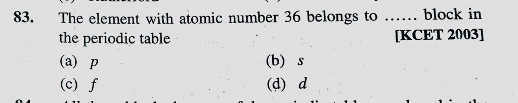 The element with atomic number 36 belongs to …………………………. block in the periodic table (a) P (b) s (c) f (d) d The element with atomic number 36 belongs to ............................... block in the periodic table (a) P (b) s (c) f (d) d November 9, 2020 Category: Uncategorised (JEE Advanced Physics by BM Sharma + GMP Solutions) , Facebook Messenger WhatsApp Share this:TwitterFacebook Related