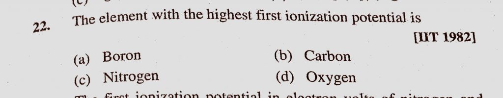 The element with the highest ionization potential is (a) Boron (b) Carbon (c) Nitrogen (d) Oxygen The element with the highest ionization potential is (a) Boron (b) Carbon (c) Nitrogen (d) Oxygen November 10, 2020 Category: Uncategorised (JEE Advanced Physics by BM Sharma + GMP Solutions) , Facebook Messenger WhatsApp Share this:TwitterFacebook Related