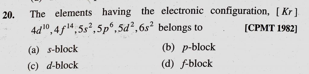 The elements having the electronic configuration, (Kr) 4d10, 4f14, 5s2, 5p6, 5d2, 6s2 belongs to (a) s-block (b) p-block (c) d-block (d) f-block (Kr) 4d10 4f14 5d2 5p6 5s2 6s2 belongs to (a) s-block (b) p-block (c) d-block (d) f-block The elements having the electronic configuration November 8, 2020 Category: Uncategorised (JEE Advanced Physics by BM Sharma + GMP Solutions) , Facebook Messenger WhatsApp Share this:TwitterFacebook Related