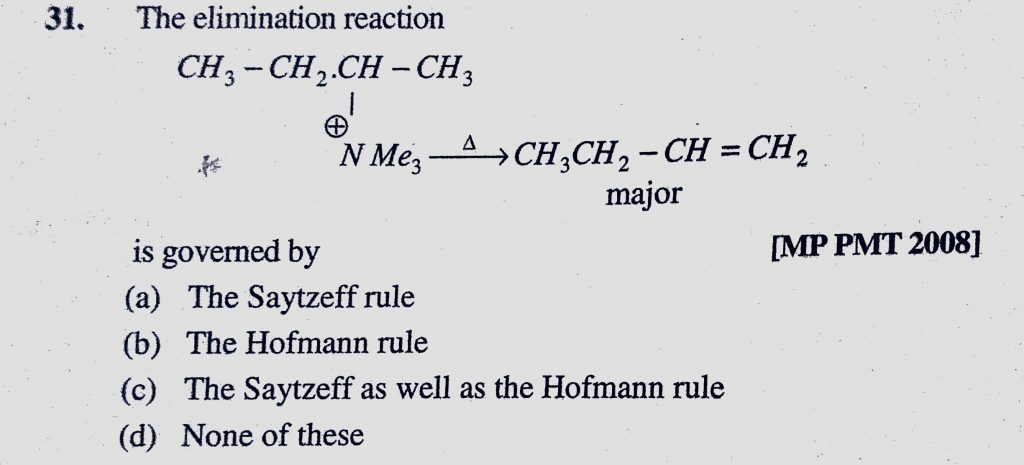 The elimination reaction is governed by (a) The Saytzeff rule (b) The Hofmann rule (c) The Saytzeff as well as the Hofmann rule The elimination reaction is governed by (a) The Saytzeff rule (b) The Hofmann rule (c) The Saytzeff as well as the Hofmann rule December 9, 2020 Category: Uncategorised (JEE Advanced Physics by BM Sharma + GMP Solutions) , Facebook Messenger WhatsApp Share this:TwitterFacebook Related