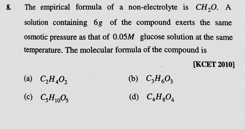 The empirical formula of a non-electrolyte is CH2O. A solution containing 3 g L−1 of the compound exerts the same osmotic pressure as that of 0.05 M glucose solution. The molecules formula of the compound is : If the various terms in the given below expressions have usual meanings the van't Hoff factor (i) cannot be calculated byb which one of the expressions December 14, 2020 Category: Uncategorised (JEE Advanced Physics by BM Sharma + GMP Solutions) , Facebook Messenger WhatsApp Share this:TwitterFacebook Related