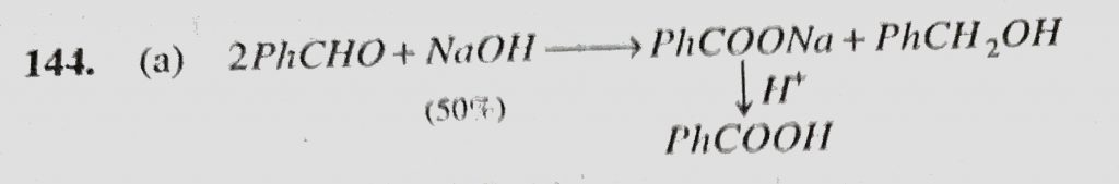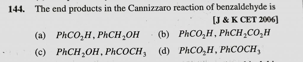 The end products in the Cannizzaro reaction of benzaldehyde is (a) PhCO2H, PhCH2OH (b) PhCO2H, PhCH2CO2H (c) PhCH2OH, PhCOCH3 (d) PhCO2H, PhCOCH3 PhCH2CO2H (c) PhCH2OH PhCH2OH (b) PhCO2H PhCOCH3 PhCOCH3 (d) PhCO2H The end products in the Cannizzaro reaction of benzaldehyde is (a) PhCO2H February 12, 2021 Category: Uncategorised (JEE Advanced Physics by BM Sharma + GMP Solutions) , Facebook Messenger WhatsApp Share this:TwitterFacebook Related